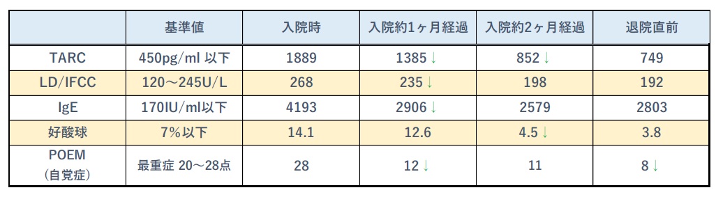 入院時の検査結果では、皮膚炎の程度を反映するTARCが1889と当院の入院患者さんとしては高値ではありませんが、これは強い皮膚症状が比較的狭い範囲に集中していたたことが影響していると考えます。