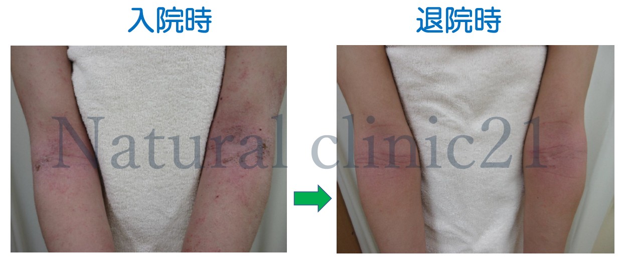 生後7ヶ月から2ヶ月半ほど国立病院に入院して食物アレルギーの除去食を行ったところ、皮膚炎は改善し、その後しばらくアトピー症状は出なかった。