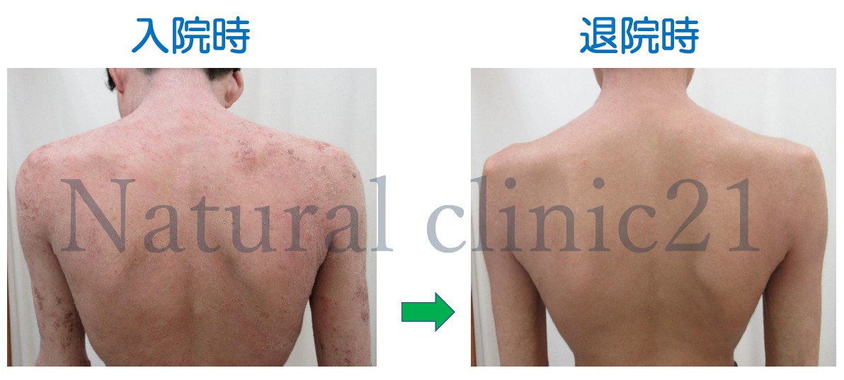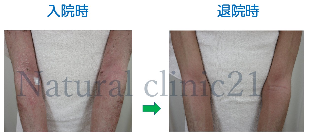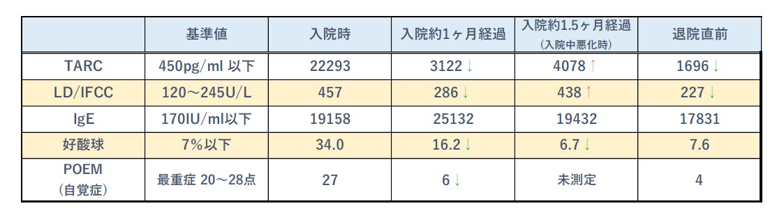 入院時の検査で皮膚炎の程度を反映するTARCが22293pg/ml(基準値450pg/ml)と、最重症状態で入院なさった患者さんで、他のアトピーの主要な検査項目も高値なことからも、強い皮膚炎が生じていたことがわかります。