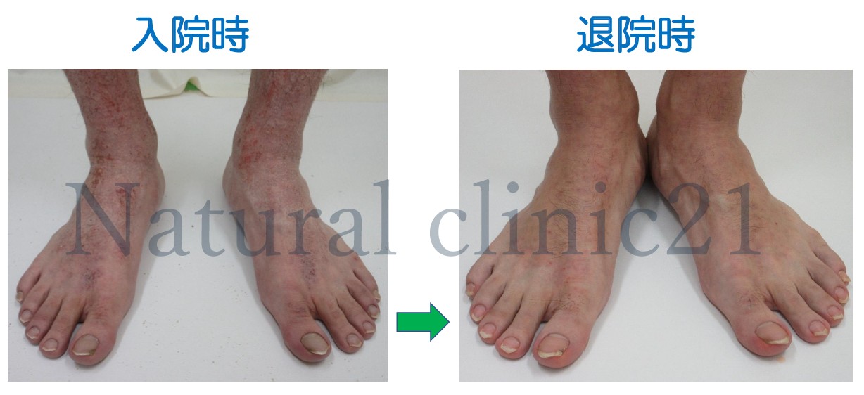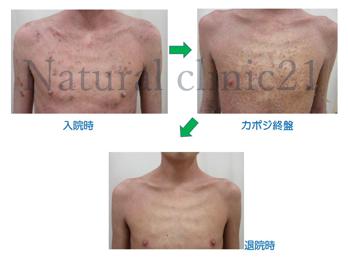 入院中にカポジが生じた患者さん(バイオ入浴実践者)ではよくあるケースですが、ヘルペスウイルスに対抗するためにTh1タイプの免疫がより活性化して、皮膚炎を急激に改善させたのだと考えられます。