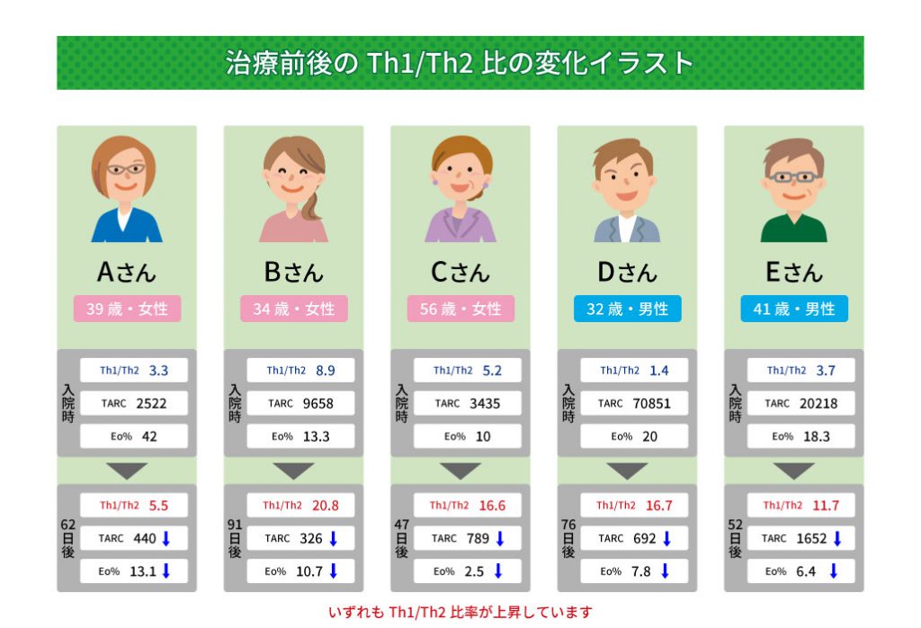 過去の統計では、入院した患者さんの約 9 割で、アトピーの炎症指標である TARC 値が平均 90%近く低下しています。これは有名医学誌「NEJM」で報告されたデュピルマブの効果に匹敵する効果です。