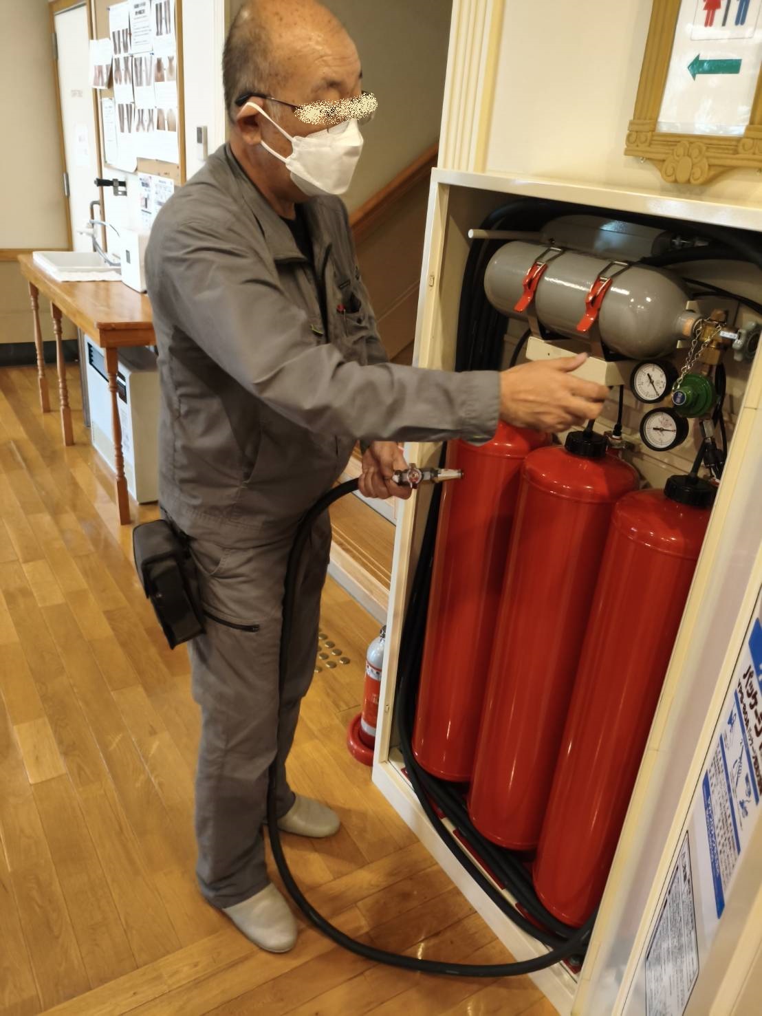 消防訓練では、消防署への通報訓練や水消火器を使っての初期消火訓練をしたり、パッケージ型消火栓の使い方を業者の方から改めて説明していただきました。